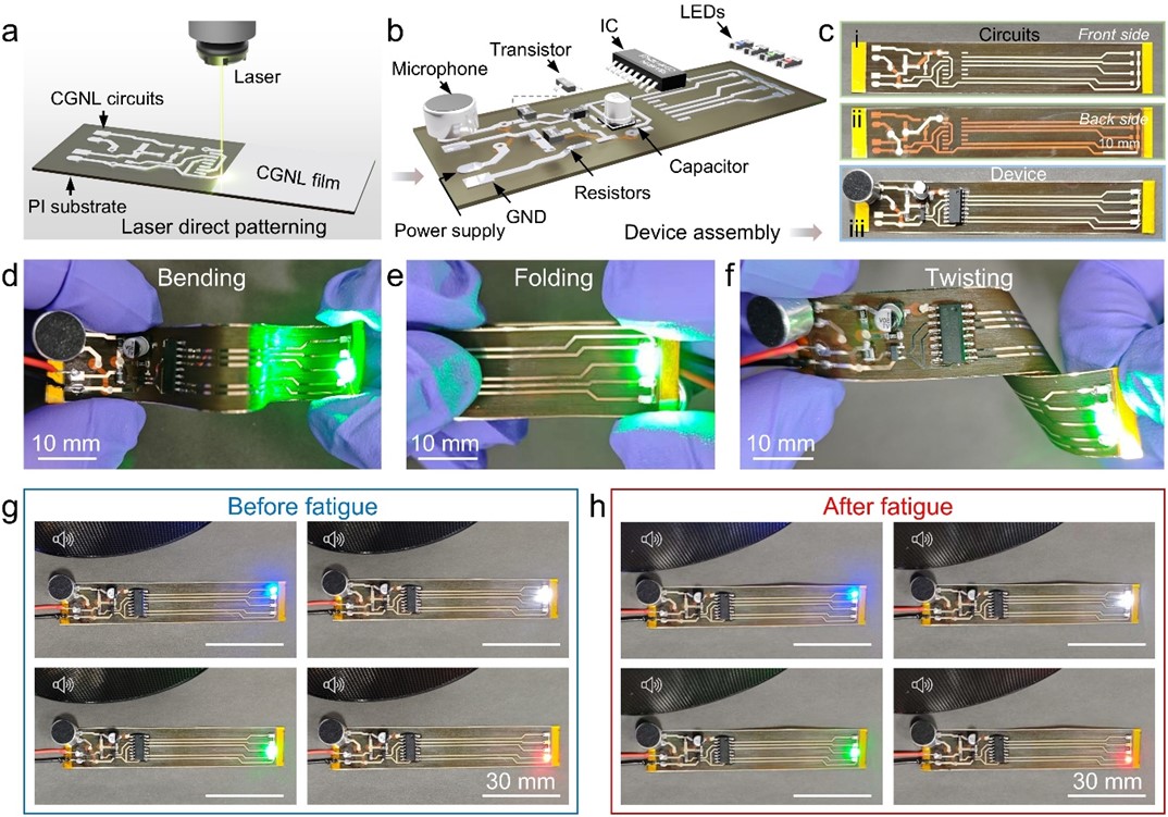 Figure 4. Flexible functional circuits based on the Ag/Al CGNL film. (a) Schematic of the fabrication process. (b) Structural design of a four-color flashing circuit. (c) Photographs of the circuit (front side, back side, and assembled state). (d–f) Circuit performance under bending, folding, and twisting. (g–h) Visual display of the LED flash circuit based on Ag/Al CGNL electrodes before and after fatigue testing.