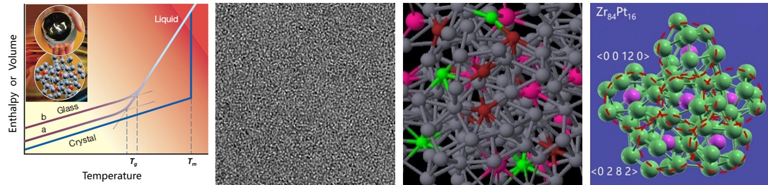 Figure 1. Amorphous alloy produced by liquid quenching and its internal structure. Left: rapid cooling bypasses crystallization to form a glass, which resembles ordinary alloys in appearance yet lacks crystalline order. A representative high-resolution TEM image is shown here, displaying a maze-like pattern. Right: representative local atomic configurations from first-principles molecular dynamics. Short line segments connecting the atoms indicate nearest-neighbor contacts (not directional bonds), forming coordination polyhedra. Different sphere colors denote different elements. For example, Pt is in pink and Zr in green in the right-side panel. Although seemingly random, atoms pack in recurring motifs, as highlighted using dashed contours. These motifs are representative structural building blocks.