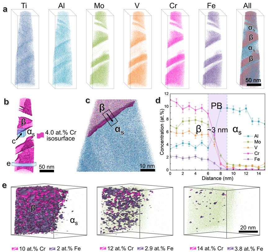 The extraordinary mechanical response arises from a carefully engineered microstructure comprising nano-twinned α precipitates and ultrafine β subgrains (Figure 2). High-density nanoscale α precipitates, mediated by ω-phase precursors, provide strong strengthening. More importantly, the formation of twin pairs among these α precipitates generates coherent twin boundaries that effectively accommodate strain incompatibility across semi-coherent α/β interfaces, thereby enhancing ductility. The ultrafine β subgrain boundaries play multiple roles: during deformation they impede dislocation motion and promote strain partitioning, while during aging they stimulate heterogeneous precipitation of nanoscale α laths. Unlike the continuous grain-boundary α films typically found at β grain boundaries, these discontinuous subgrain-boundary α precipitates serve dual functions—acting as dislocation sources to activate plasticity and simultaneously hindering dislocation glide to increase work-hardening capacity and uniform elongation. Furthermore, under high applied stress, chemically induced heterogeneities (Figure 3) strongly interact with dislocations, slowing their motion and enhancing dislocation interactions, which further improves strain hardening and delays the onset of necking.